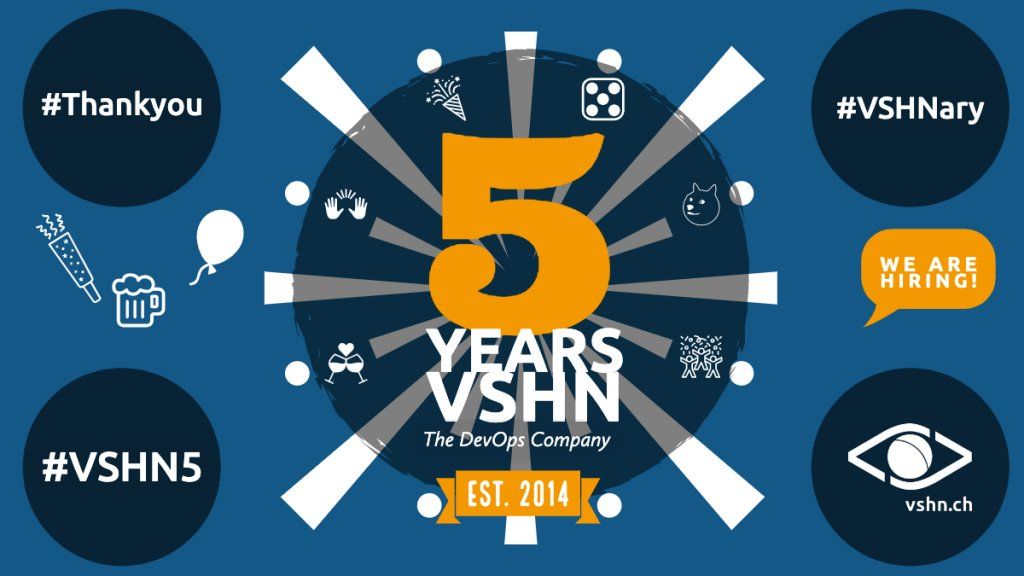 Wir können es kaum glauben, dass es bereits 5 Jahre her ist, seit wir die VSHN gegründet haben. Unsere ersten 5 Jahre waren fantastisch und wir können das Erlebte kaum in Worte fassen. Nur soviel sei gesagt: Wir bedanken uns 1000 Mal bei allen Partnern, Kunden und allen anderen, die uns auf dem bisherigen Weg begleitet haben und freuen uns auf die Zukunft und die nächsten 5 Jahre!